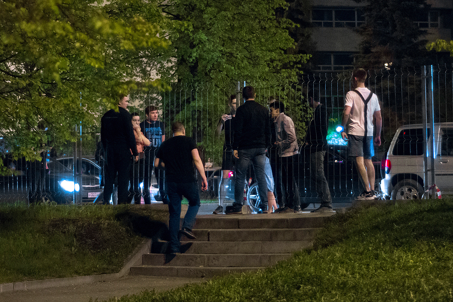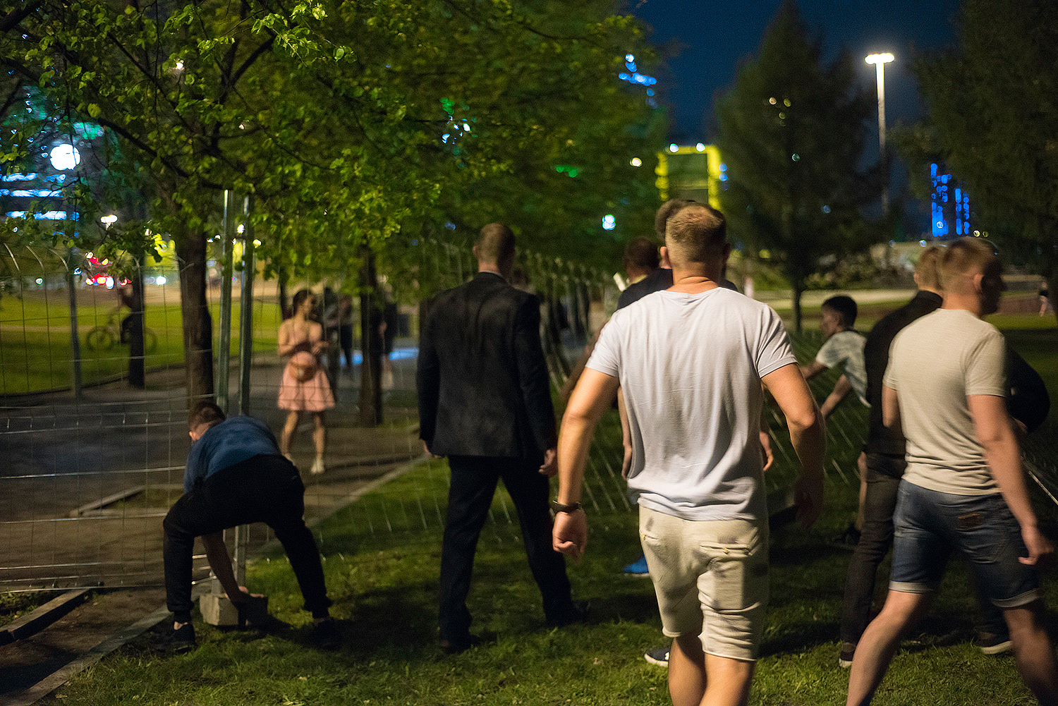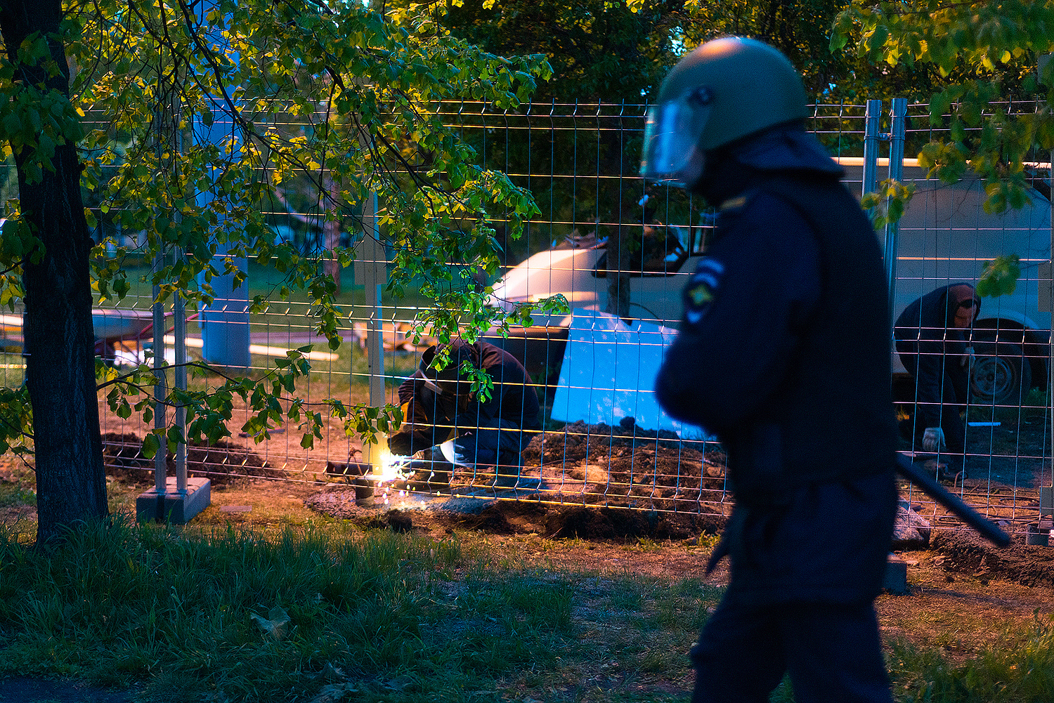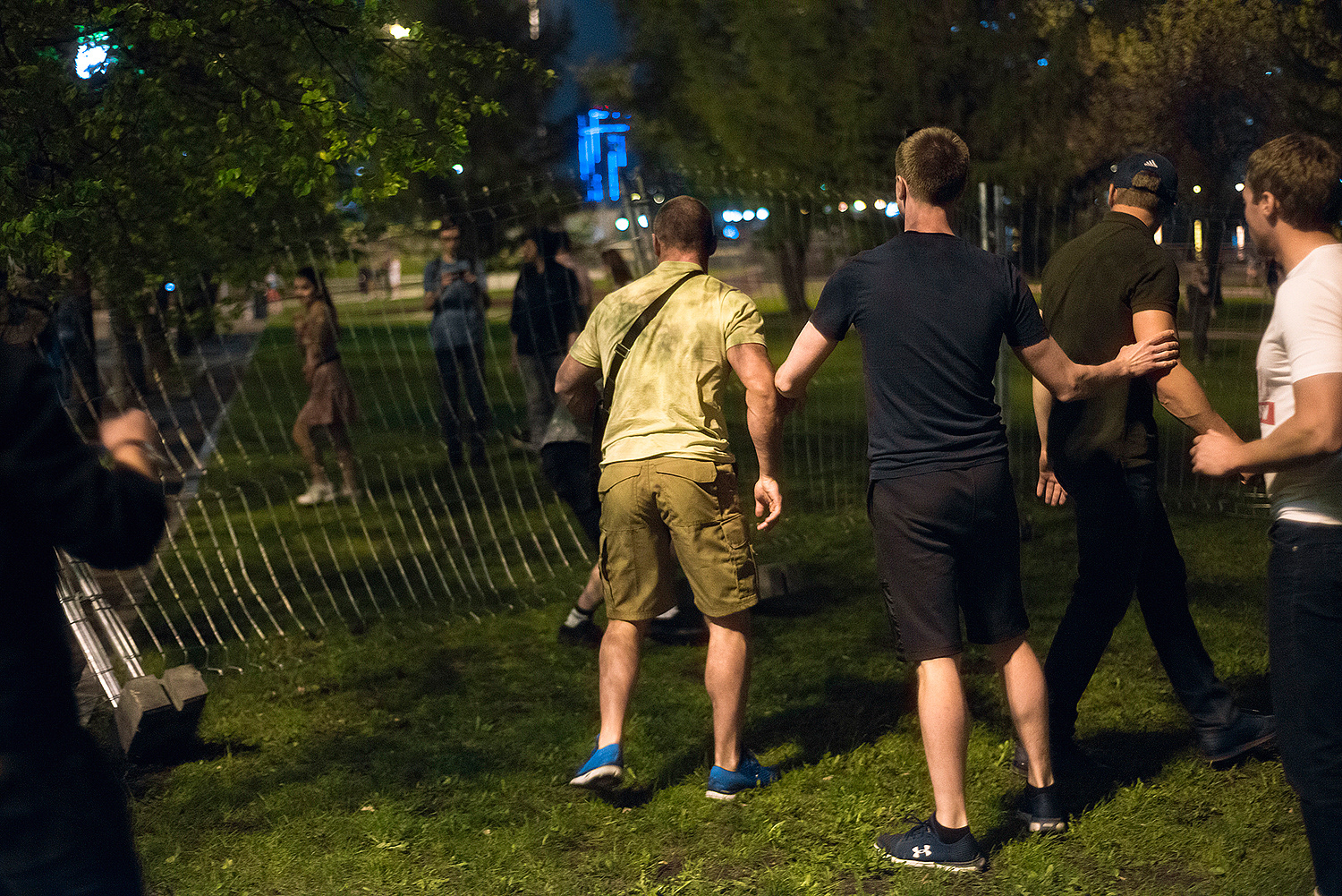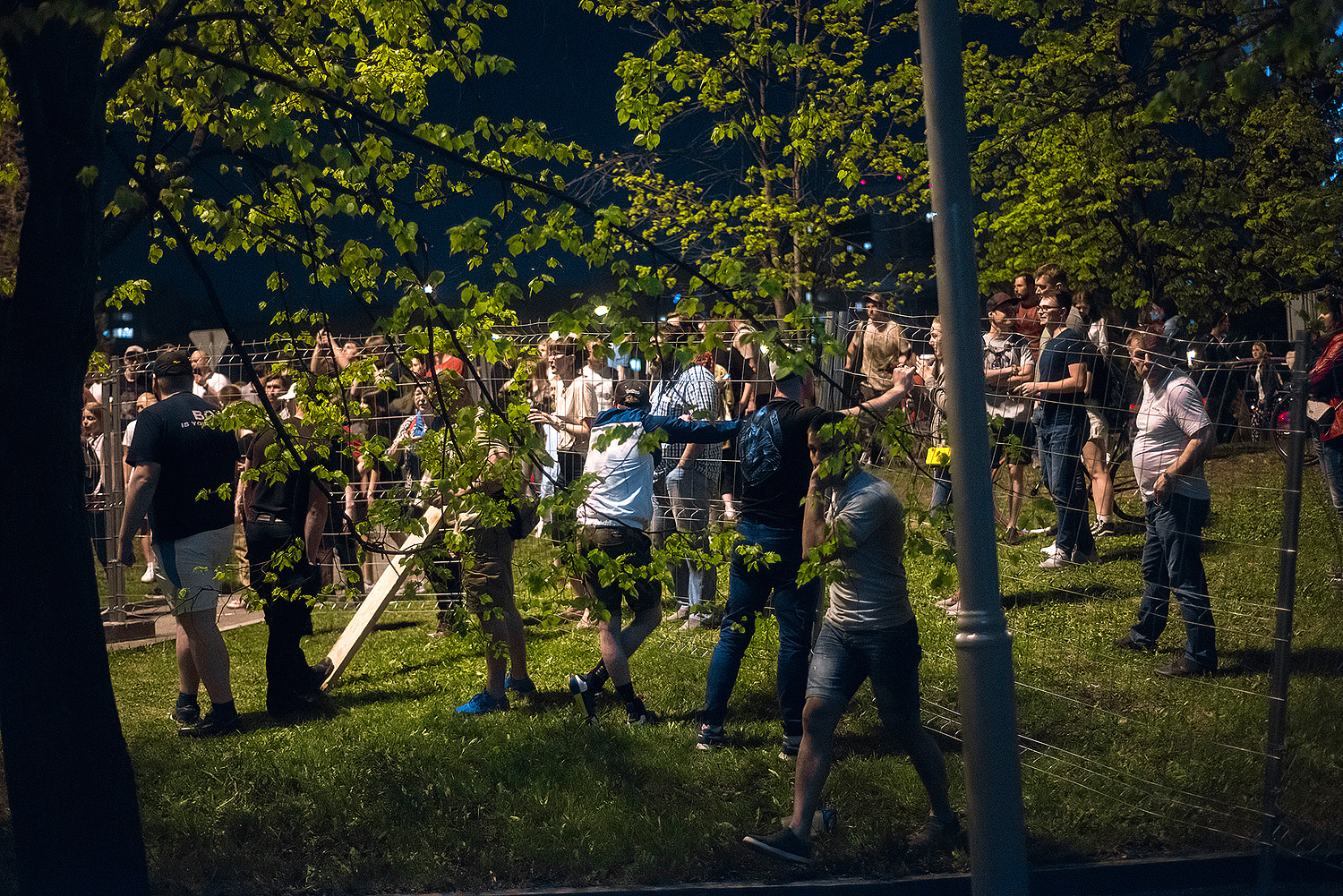 После падения забора народ стал ликовать, драма превратилась в подобие Вудстока, охрана РМК встала вокруг своей единственной палатки. Это нормально, приказ есть приказ. Второго шага не последовало, да и не нужен он был, не тот вопрос, чтобы устраивать революцию. Стали возникать случаи провокаций со стороны сторонников сквера, причём крайне трусливые и нечестные. Охране в глаза тыкали объективами, подолгу снимали, удерживая телефон прямо перед лицом. Я, конечно, всё могу понять, но это уже не борьба и отстаивание своих интересов, а какой-то идиотизм. Любой может на улице дать в лицо за такое, здесь же фотографы просто обнаглели, понимая резонансность ситуации. Но, охрана не повелась на эти выходки, молодцы. Им смеялись прямо в лицо, обзывали, светили фонарями прямо в глаза. Те, кто боялся обзывать, становились рядом и громко заводили разговор, о том «какие же охранники дебилы». Ты как бы хочешь, чтобы тебе дали в лицо, но боишься сделать первый шаг, в итоге начинаешь создавать прецедент. Все эти методы воздействия выглядят смешно и нечестно, так как в данном случае оскорбление идёт не в сторону РМК и мэрии, а в сторону обычного мужика-охранника, у которого есть терпение и собственное достоинство. В общем я считаю это всё неуместным переходом на личности. Также я неоднократно слышал обзывательства в сторону полиции от дражайшего Е1, их называли космонавтами и всяко стебались. Конечно, назвать человека космонавтом — юридически не является оскорблением, но это стёб, насмешка, неуважение. Все это понимают. На мой взгляд это всё было трусливыми попытками вывести конфликт в фазу мордобоя, чтобы потом снимать свои побои и использовать это для бичевания. Причём сам мордобой сторона защитников сквера начинать не хотела, слишком большая ответственность и последствия, к которым никто не был подготовлен.